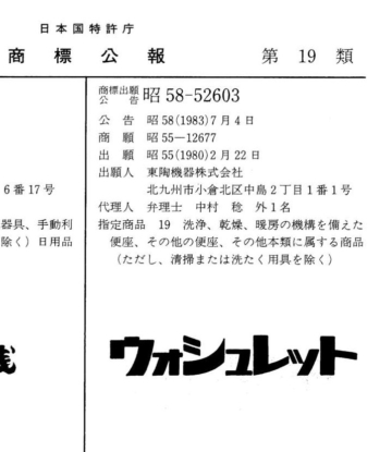 今や日本を代表する電化製品といえる温水洗浄便座として世界中に広く知れ渡っている商品名ですが、これもTOTO株式会社が所有する登録商標です(商標登録第第1665963号)。