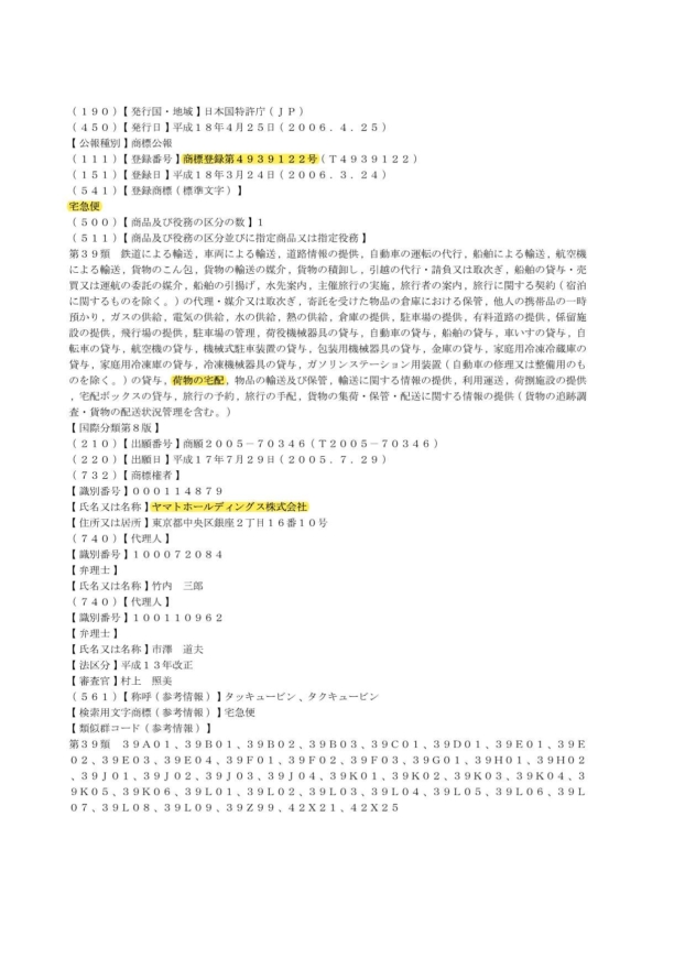 宅配サービスといえば誰もがすぐに思いつくほどに広く知られていますが、これもヤマトホールディングス株式会社が所有する登録商標です(商標登録第4939122号他)。